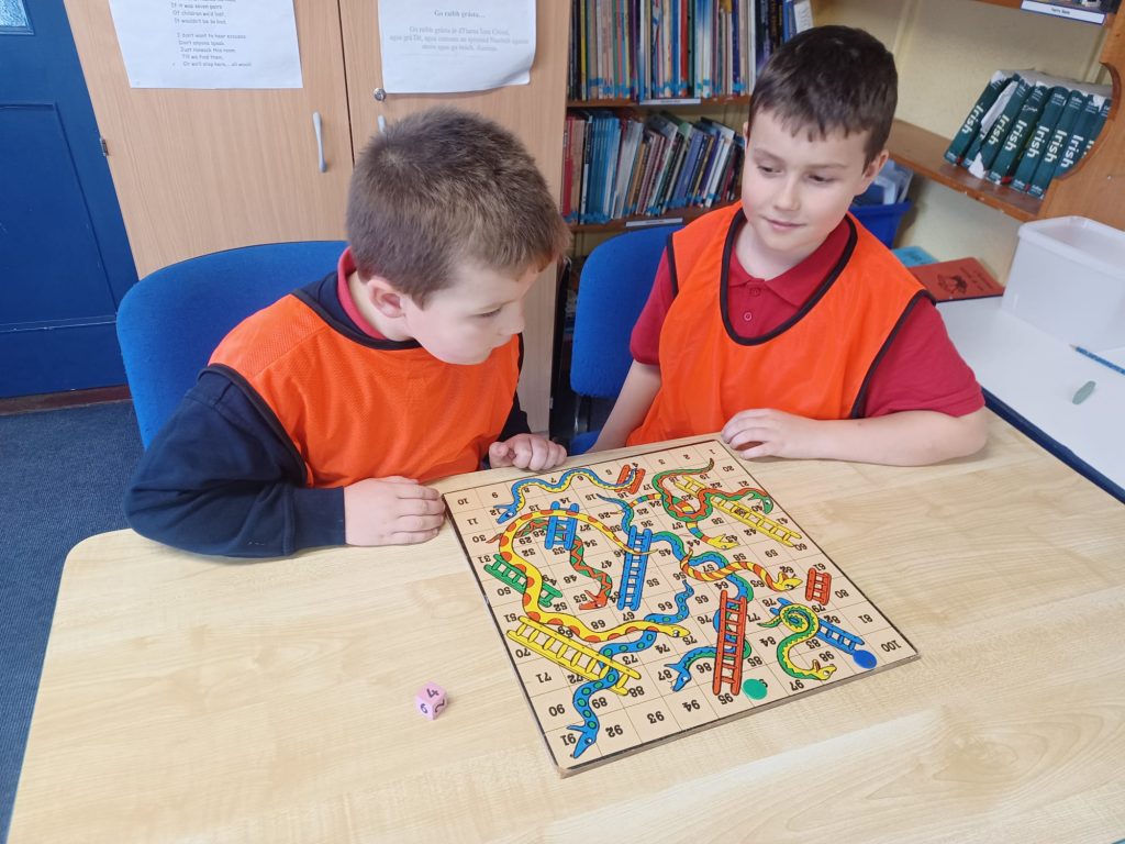 The Middle Room were also busy playing lots of Maths games – we played What’s my number?, card games, Sums Up and even Snakes and Ladders – Nathracha agus Dréimire – in Gaeilge!